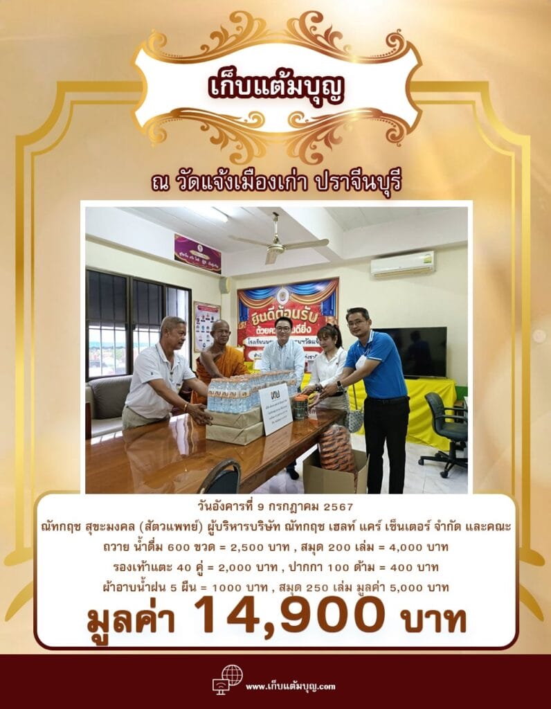 วันอังคารที่ 9 กรกฎาคม 2567ณัทกฤช สุขะมงคล (สัตวแพทย์) ผู้บริหารบริษัท ณัทกฤช เฮลท์ แคร์ เซ็นเตอร์ จำกัด และคณะ ถวายน้ำดื่ม 600 ขวด = 2,500 บาทสมุด 200